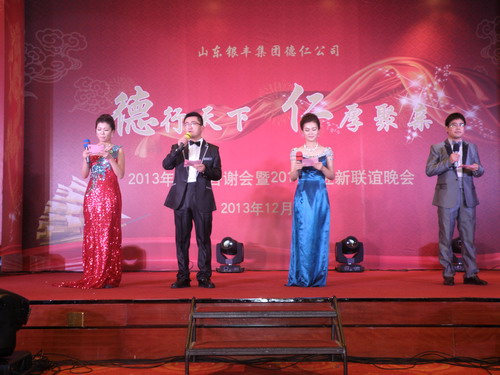 2013年12月21日下午16時,山東德仁經(jīng)濟(jì)貿(mào)易有限公司2013年“德行天下 仁厚聚親”廠商答謝會暨2014年新春聯(lián)誼晚會于藍(lán)海大酒店藍(lán)海大廳如期召開。本次大會到會廠商、經(jīng)銷商代表及社會各界來賓共計130余人,銀豐集團(tuán)董事長王偉先生、金融投資事業(yè)部總經(jīng)理趙曉陽先生、總經(jīng)理助理張伊辰女士、德仁公司總經(jīng)理朱倩女士等領(lǐng)導(dǎo)出席了答謝會。