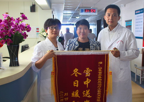 2014年8月14日上午,在醫(yī)院腫瘤科完成自體血液采集工作后,患者劉某家屬解女士激動地向山東省齊魯細(xì)胞治療工程技術(shù)有限公司相關(guān)人員及醫(yī)院腫瘤科全體醫(yī)護(hù)人員敬獻(xiàn)了旌旗,表達(dá)謝意。