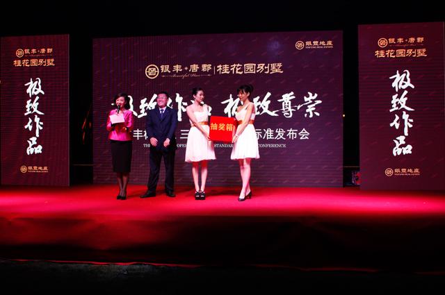 發(fā)布會(huì)現(xiàn)場(chǎng),除了對(duì)銀豐標(biāo)準(zhǔn)之三心物業(yè)服務(wù)標(biāo)準(zhǔn)進(jìn)行介紹外,還為到場(chǎng)嘉賓們準(zhǔn)備了豐盛的晚宴、精彩的文藝表演及激動(dòng)人心的抽獎(jiǎng)活動(dòng)。半山之上,月色之中,飲美酒、品佳肴,嘉賓們樂在其中。舞蹈節(jié)目華麗的舞姿呈現(xiàn)與眾不同的美感,小提琴演奏悠揚(yáng)的琴聲讓人感受心靈的悠閑,為嘉賓了帶來了一段愉悅的時(shí)光。抽獎(jiǎng)環(huán)節(jié)中,10萬元購(gòu)房代金券、GUCCI皮包、iphone6等讓人驚艷的眾多超級(jí)大獎(jiǎng)在現(xiàn)場(chǎng)一一抽出。