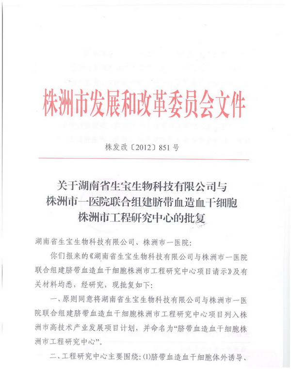 2012年12月26日湖南省生寶生物科技有限公司獲得株洲市發(fā)改委正式批復(fù),原則上同意生寶公司與株洲市一醫(yī)院聯(lián)合組建臍帶血造血干細(xì)胞株洲市工程研究中心。這標(biāo)志著湖南生寶公司今后開(kāi)展的業(yè)務(wù)將更加規(guī)范化,更加有序。
