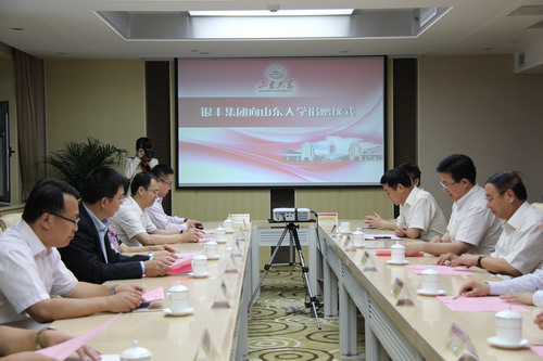 2013年5月17日,山東銀豐投資集團(tuán)有限公司向山東大學(xué)捐贈(zèng)簽約儀式在山東大學(xué)中心校區(qū)舉行。銀豐集團(tuán)向山東大學(xué)捐贈(zèng)400萬(wàn)元人民幣,支持山東大學(xué)教育事業(yè)發(fā)展。校黨委書(shū)記、校董會(huì)主席李守信在儀式上講話并向銀豐集團(tuán)董事長(zhǎng)王偉頒發(fā)校董聘書(shū)。總會(huì)計(jì)師曹升元與王偉共同簽署了捐贈(zèng)協(xié)議,并代表學(xué)校向王偉頒發(fā)了捐贈(zèng)證書(shū)。