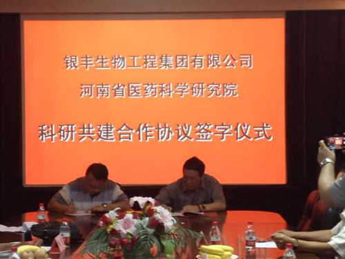 2014年7月8日,銀豐生物集團(tuán)與河南省醫(yī)藥科學(xué)研究院合作協(xié)議簽約儀式在鄭州市隆重舉行,生物集團(tuán)總裁生德偉與河南省醫(yī)藥科學(xué)研究院院長(zhǎng)楊波共同簽署了共建協(xié)議。河南省科技廳社發(fā)處處長(zhǎng)楊光、鄭州大學(xué)副校長(zhǎng)???biāo)、別榮海、科技處處長(zhǎng)趙明皞受邀參加簽約儀式。楊光處長(zhǎng)在儀式上發(fā)表重要講話,介紹了目前科技部在各省設(shè)立人類遺傳資源庫(kù)的政策,表示銀豐生物集團(tuán)與河南省醫(yī)藥科學(xué)研究院強(qiáng)強(qiáng)聯(lián)手共建河南省人類遺傳資源庫(kù)是利國(guó)利民的好事,科技廳將給予大力支持。