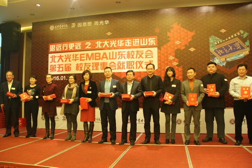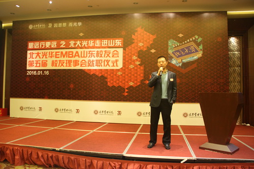 2016年1月16日,“思遠(yuǎn)行更遠(yuǎn)”北大光華EMBA走進(jìn)山東濟(jì)南活動(dòng)暨EMBA山東校友會(huì)第五屆校友理事會(huì)就職大會(huì)在山東大廈隆重舉辦。北京大學(xué)光華管理學(xué)院院長(zhǎng)蔡洪濱教授、光華管理學(xué)院黨委書(shū)記冒大衛(wèi)博士、山東銀豐投資集團(tuán)董事長(zhǎng)王偉等百余位校友及山東當(dāng)?shù)貎?yōu)秀企業(yè)家參會(huì)。
