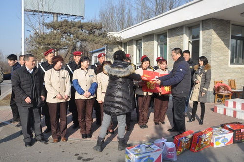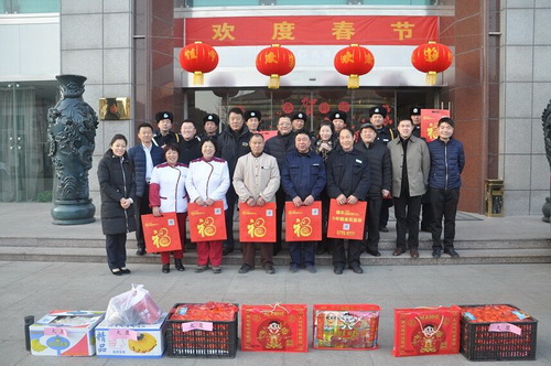 2016年2月7日,農(nóng)歷除夕,上午8:00,銀豐集團(tuán)副總裁劉旭、王彤,總裁助理湯莉及銀豐地產(chǎn)集團(tuán)副總裁李美萱、總裁助理米文斌等一行慰問(wèn)了各公司春節(jié)期間仍在堅(jiān)守崗位的一線員工。