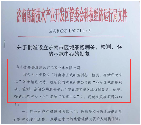 2017年11月30日,山東省齊魯細(xì)胞治療工程技術(shù)有限公司(以下簡(jiǎn)稱“齊魯細(xì)胞治療公司”)獲批設(shè)立“濟(jì)南市區(qū)域細(xì)胞制備、檢測(cè)、存儲(chǔ)示范中心”,成為濟(jì)南市首個(gè)區(qū)域細(xì)胞制備、檢測(cè)、存儲(chǔ)示范中心,齊魯細(xì)胞治療公司在濟(jì)南市細(xì)胞治療行業(yè)又一次豎立了標(biāo)桿。